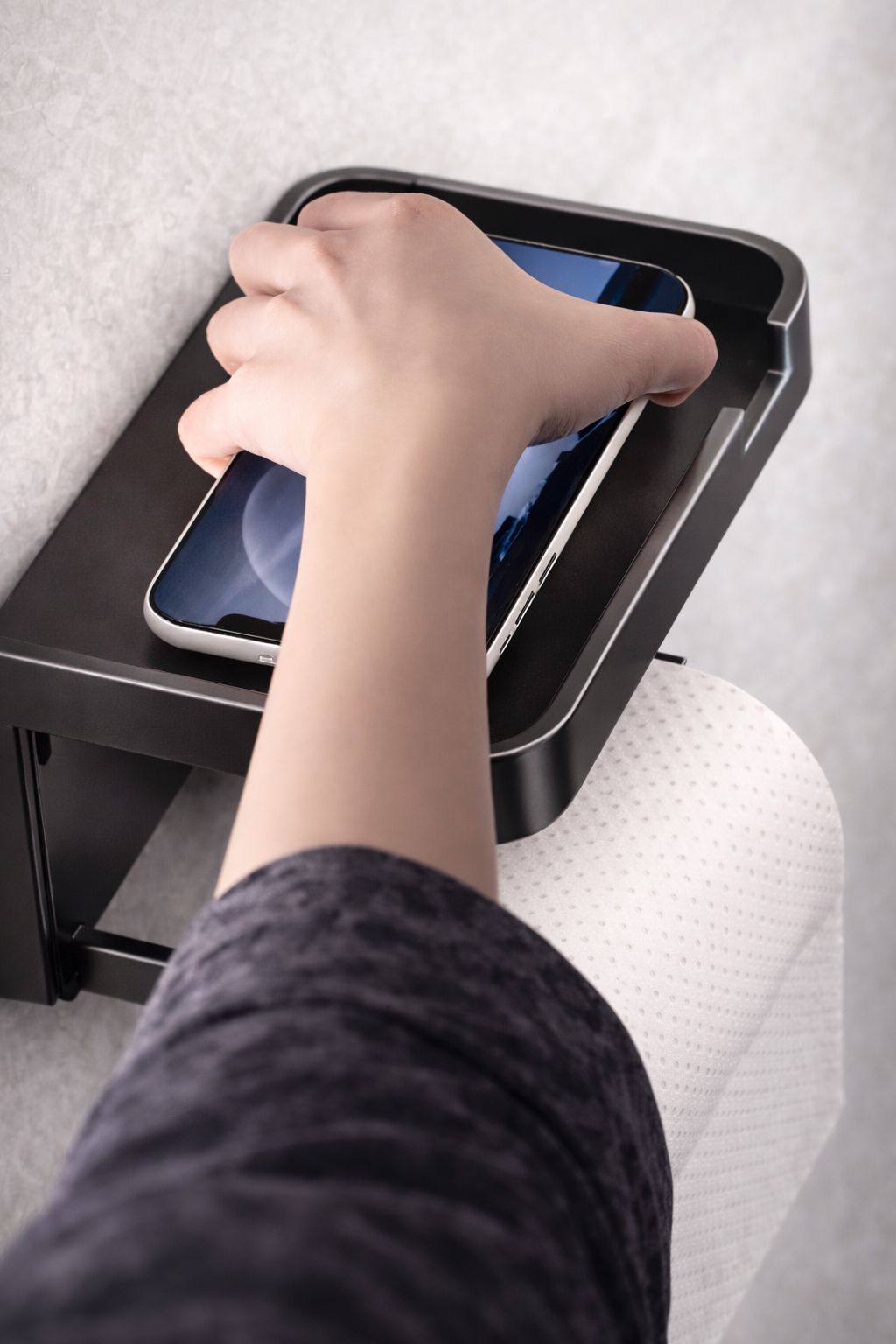 This no drill toilet roll holder features a built-in storage tray, perfect for holding your phone, keys or small essentials while keeping your space clean and organised.